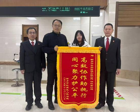 12月22日,新乡市红旗区人民法院执行局局长沈志勇、副局长彭晓明一行专程来到市行政服务中心,将一面印有“高效协作助执行 同心聚力护公平”的锦旗郑重送到市自然资源和规划局工作人员手中,以感谢市资源规划局长期以来在司法协助工作中的积极配合与大力支持。