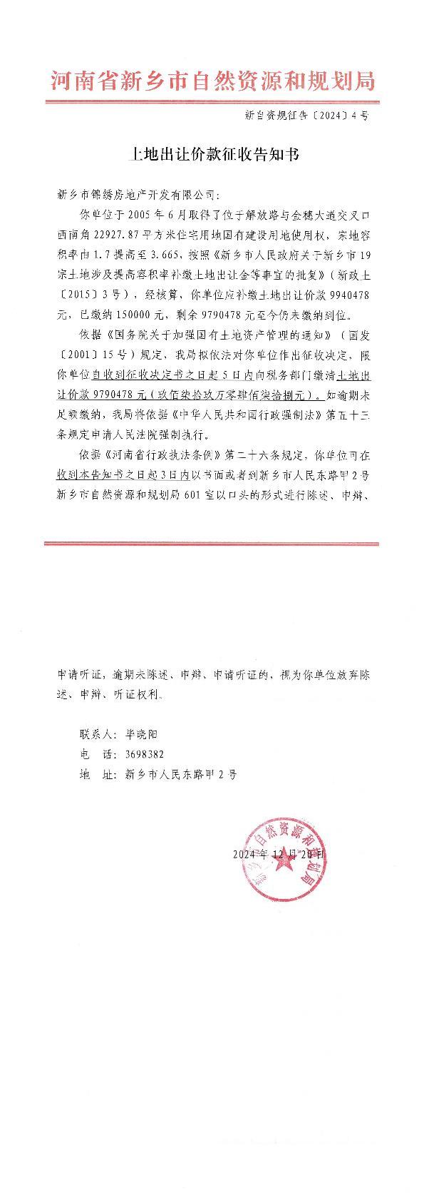 土地出让价款征收告知书 新自资规征告【2024】4号