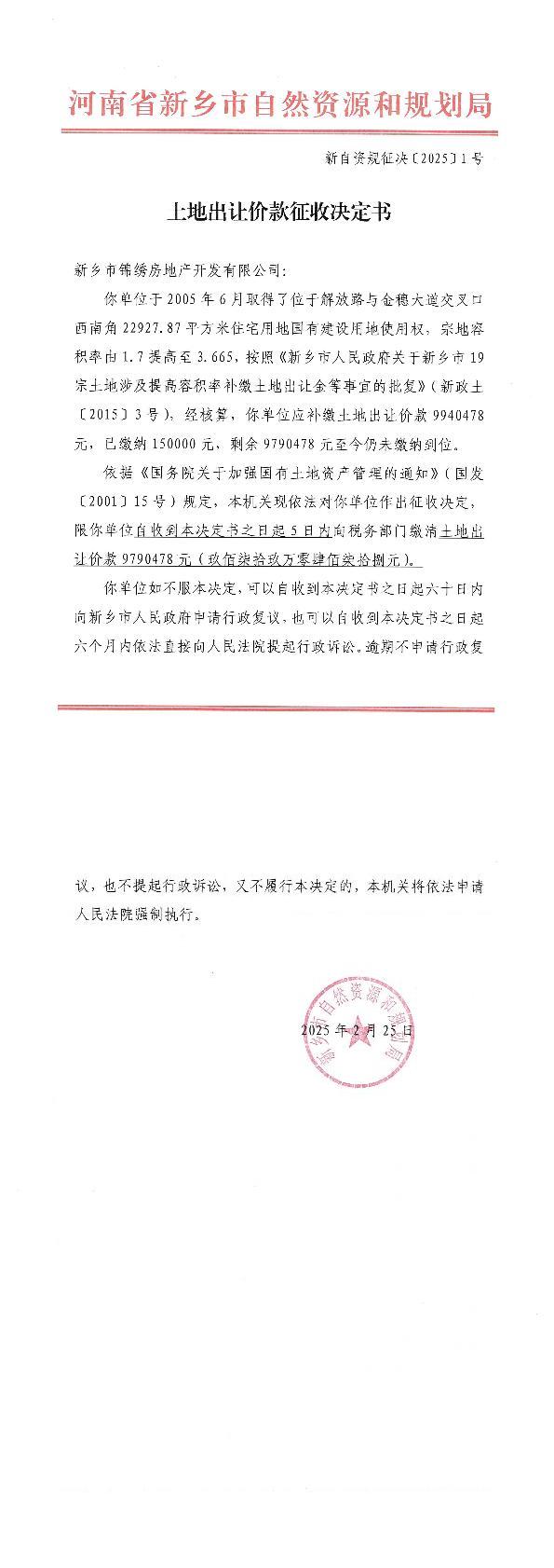 土地出让价款征收决定书 新自资规征决【2025】1号