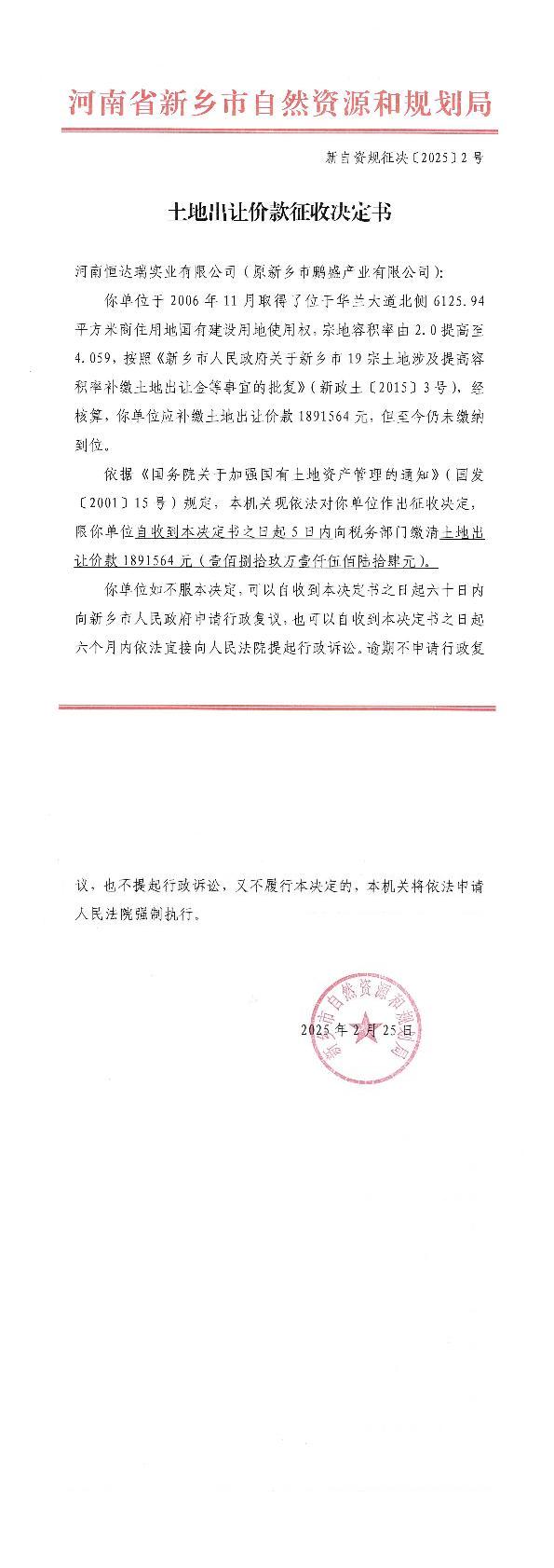 土地出让价款征收决定书 新自资规征决【2025】2号