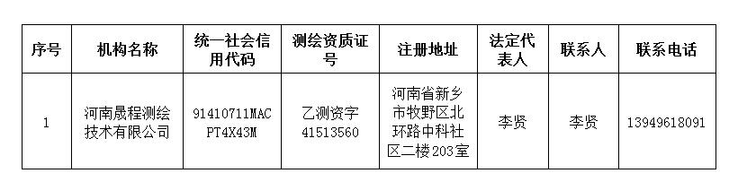 为优化我市工程建设领域涉及行政审批相关的测绘技术服务工作,根据《新乡市工程建设项目“多测合一”实施办法》要求,由测绘单位自主申报,经我局核实,现将新乡市工程建设项目“多测合一”机构名录库新增名单予以公示,公示期自发布之日起5个工作日,公示期满无异议的,纳入名录库。任何单位对公示结果有异议的,请于公示期内与我局测绘地理信息管理科联系并提供有关资料,所提供有关资料需加盖单位公章,联系邮箱 xxscgk@163.com,联系电话:3698408。