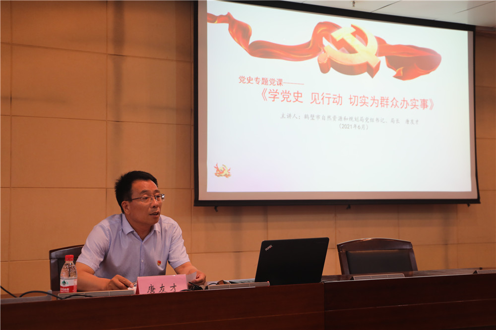 根据全省自然资源系统党史学习教育部署安排,6月30日,鹤壁市局党组书记、局长唐友才,到我局讲授党课。局党组成员、副局长王国军主持会议。局副处级以上干部,局机关各科室全体人员、局属各事业单位党政负责人100余人参加。