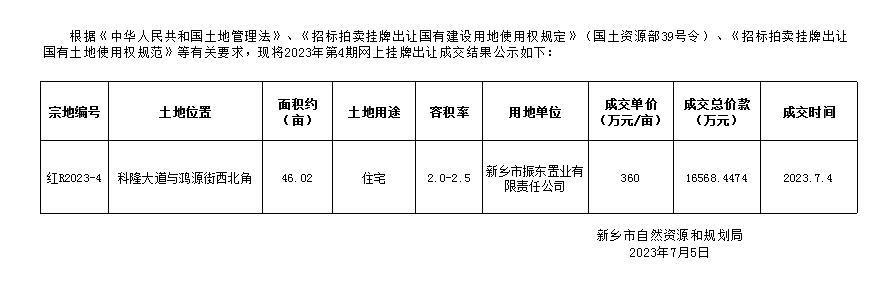 新乡市自然资源和规划局 2023年第4期网上挂牌出让国有建设用地使用权成交结果公示