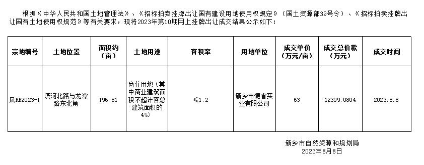新乡市自然资源和规划局2023年第10期网上挂牌出让国有建设用地使用权成交结果公示