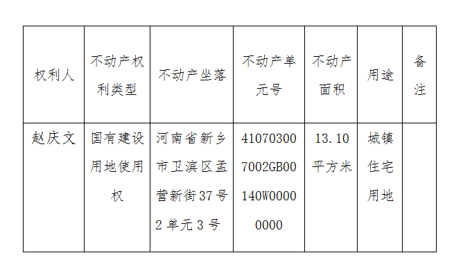 依据房屋所有权人赵庆文申请,我局对房屋所有权人所使用的土地进行实地权属调查,经调查,宗地四至清晰,权属无争议,现进行公示。如有异议者,请自本公告之日起7日内将异议书面材料送达新乡市不动产登记和交易中心 (地址:市民中心一楼不动产登记和交易中心37号窗口;联系电话:5128355),逾期无人提出异议或者异议不成立的,我局将予以登记。