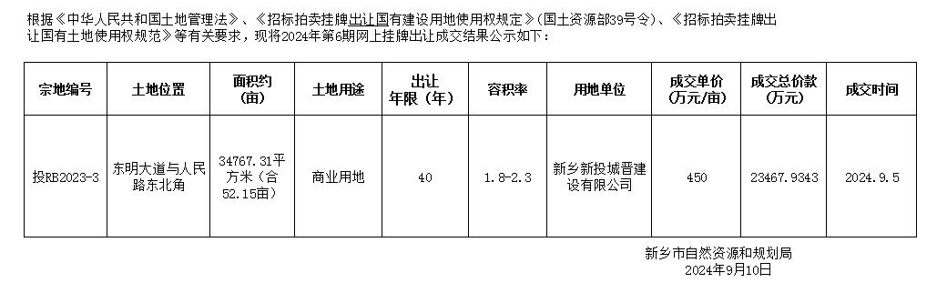 新乡市自然资源和规划局2024年第6期网上挂牌出让国有建设用地使用权成交结果公示