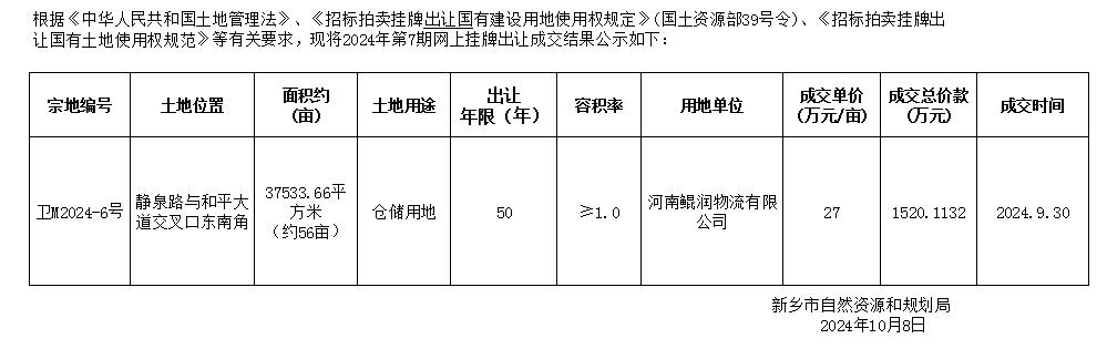 新乡市自然资源和规划局2024年第7期网上挂牌出让国有建设用地使用权成交结果公示