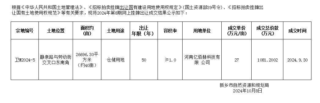 新乡市自然资源和规划局2024年第8期网上挂牌出让国有建设用地使用权成交结果公示
