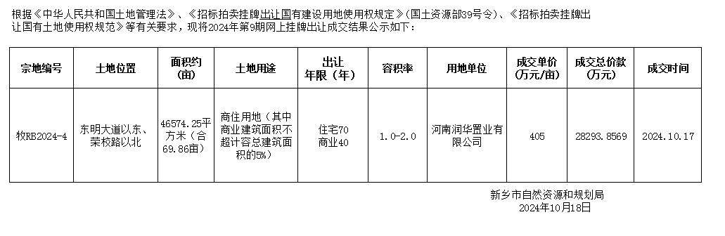 新乡市自然资源和规划局2024年第9期网上牌出让国有建设用地使用权成交结果公示