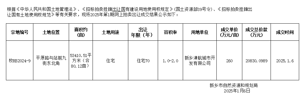 新乡市自然资源和规划局 2025年第1期网上拍卖出让国有建设用地使用权成交结公示