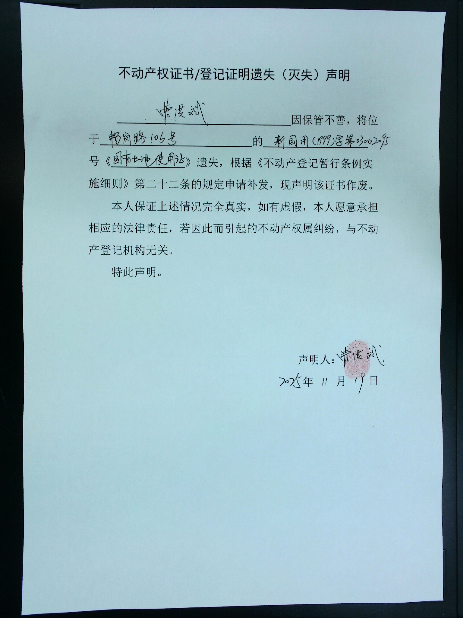 遗失声明-曹洪斌